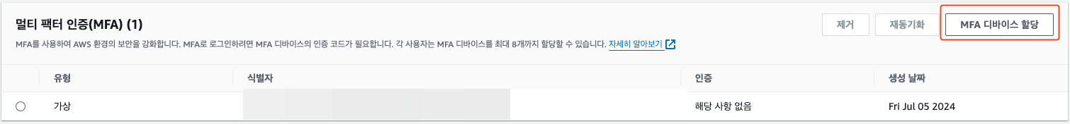 보안 자격 증명을 클릭하셔서 MFA 생성 탭으로 내려가신 다음 MFA 디바이스 할당을 통해 MFA를 생성할 수 있습니다.