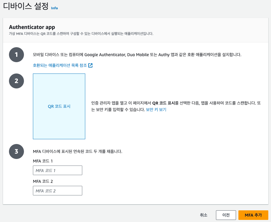 다음 으로 가서 인증 앱을 설치하고 QR 코드를 통해 MFA를 추가해주시면 됩니다.