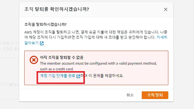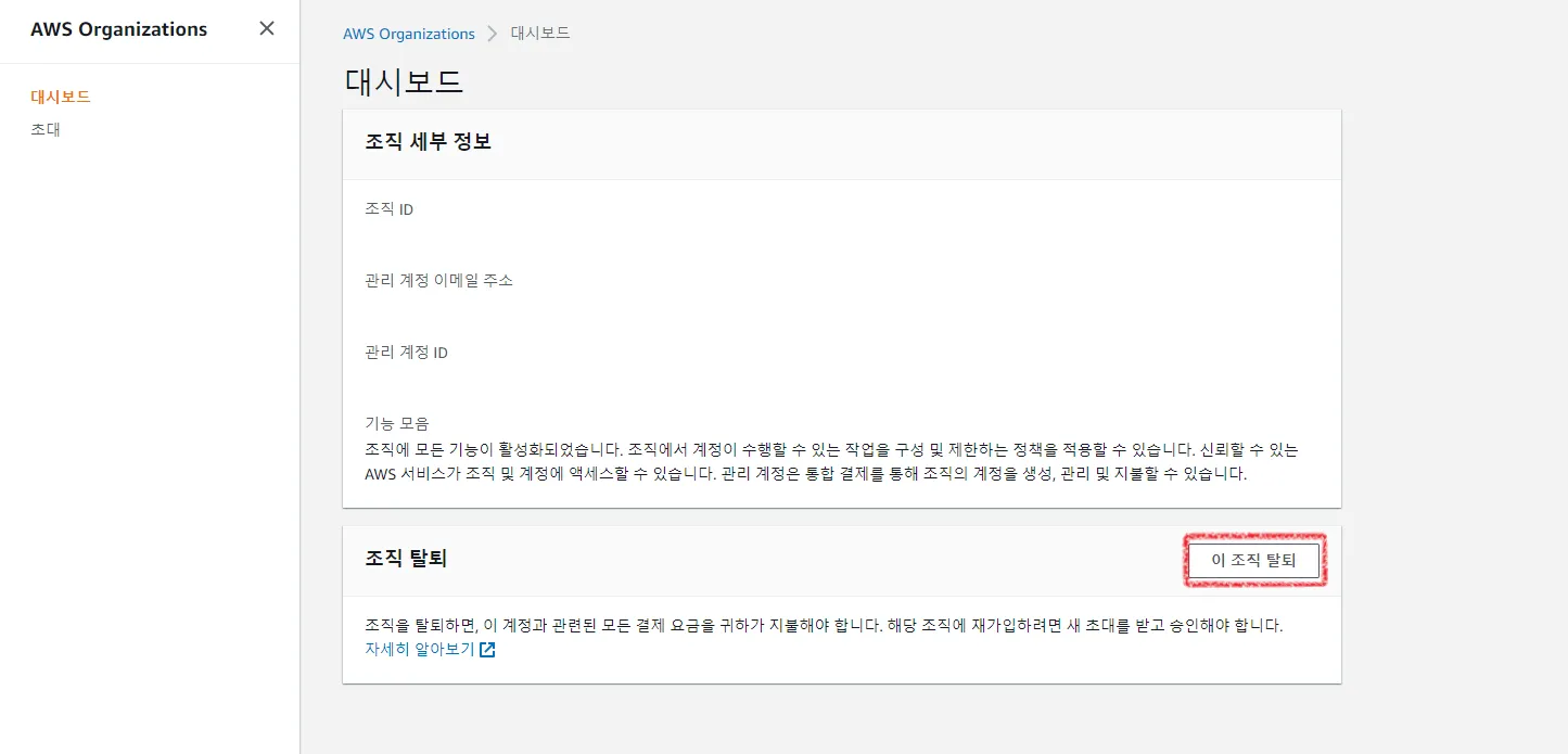 - 우측상단 계정 ID > 조직 클릭 > 대시보드 클릭 > 이 조직 탈퇴 클릭 > 조직탈퇴 클릭