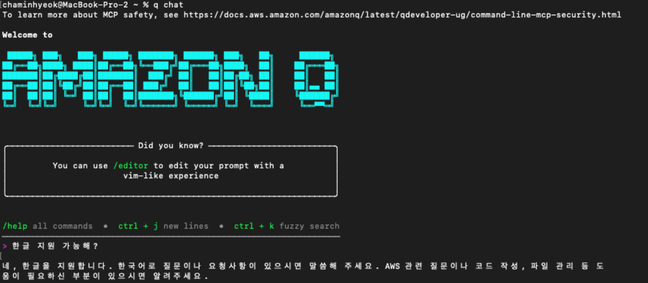4. 이후 Mac 터미널에 들어가신 다음 "q chat" 명령어를 입렵하시면 CLI에서 Q Dev를 사용하실 수 있습니다.