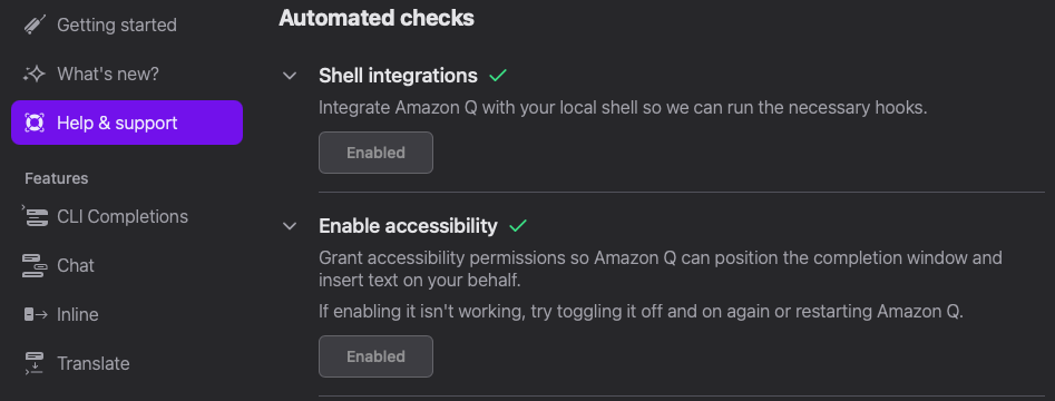 3. Q Dev App 왼쪽에 Help & support 에 Shell integration을 활성화 시켜주시면 성공입니다.
