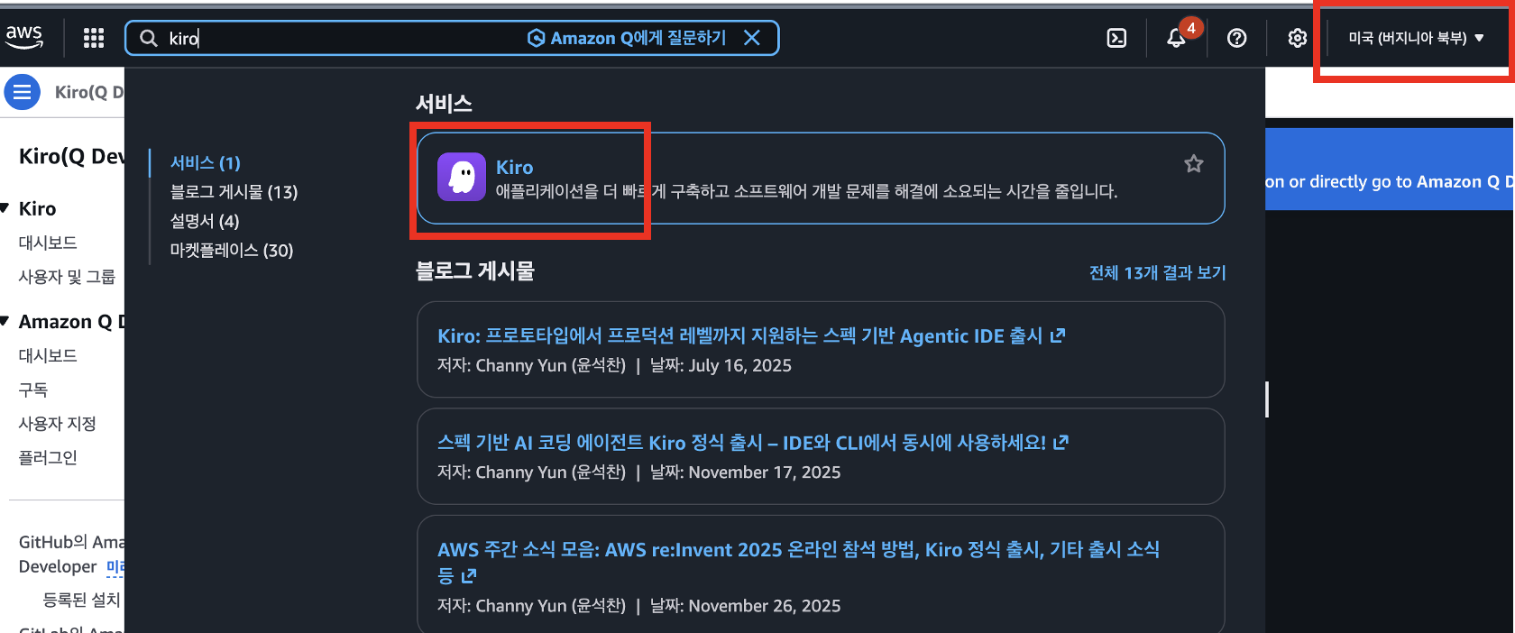 기존 구독자들은 Amazon Q 에서 직접 삭제를 해야 하며 신규 구독자 분들은 Kiro를 검색 후 서비스로 넘어와 주세요. 리전은 본인이 구독했었을 때 리전으로 선택해 주세요.
