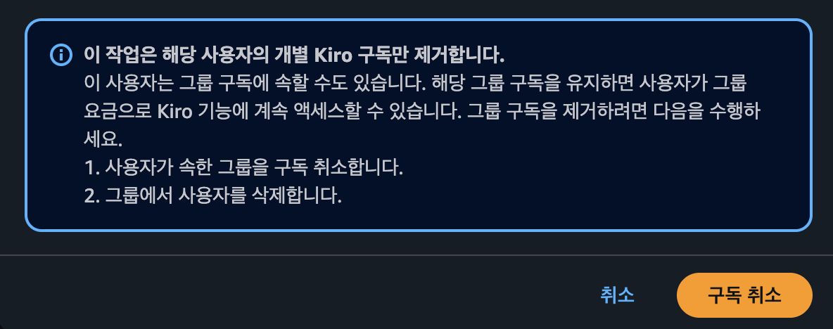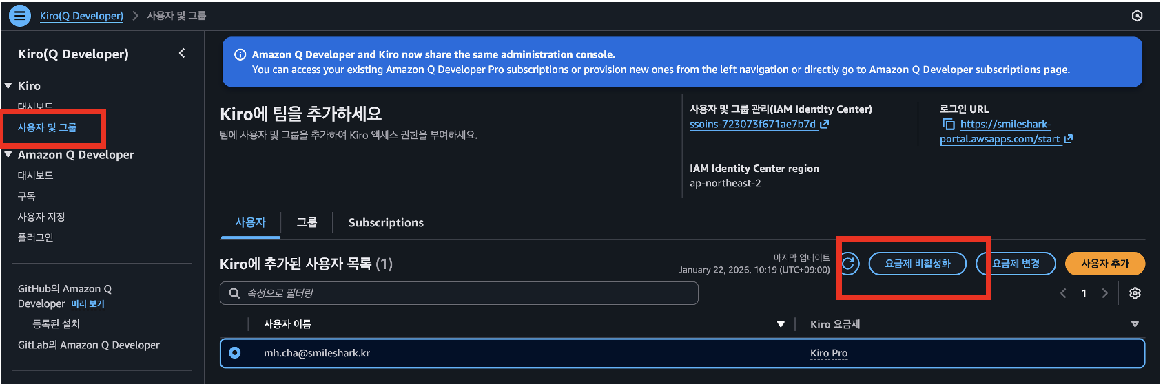Kiro에 들어오신 다음 왼쪽의 "사용자 및 그룹"을 누르면 구독자 명단이 나옵니다.