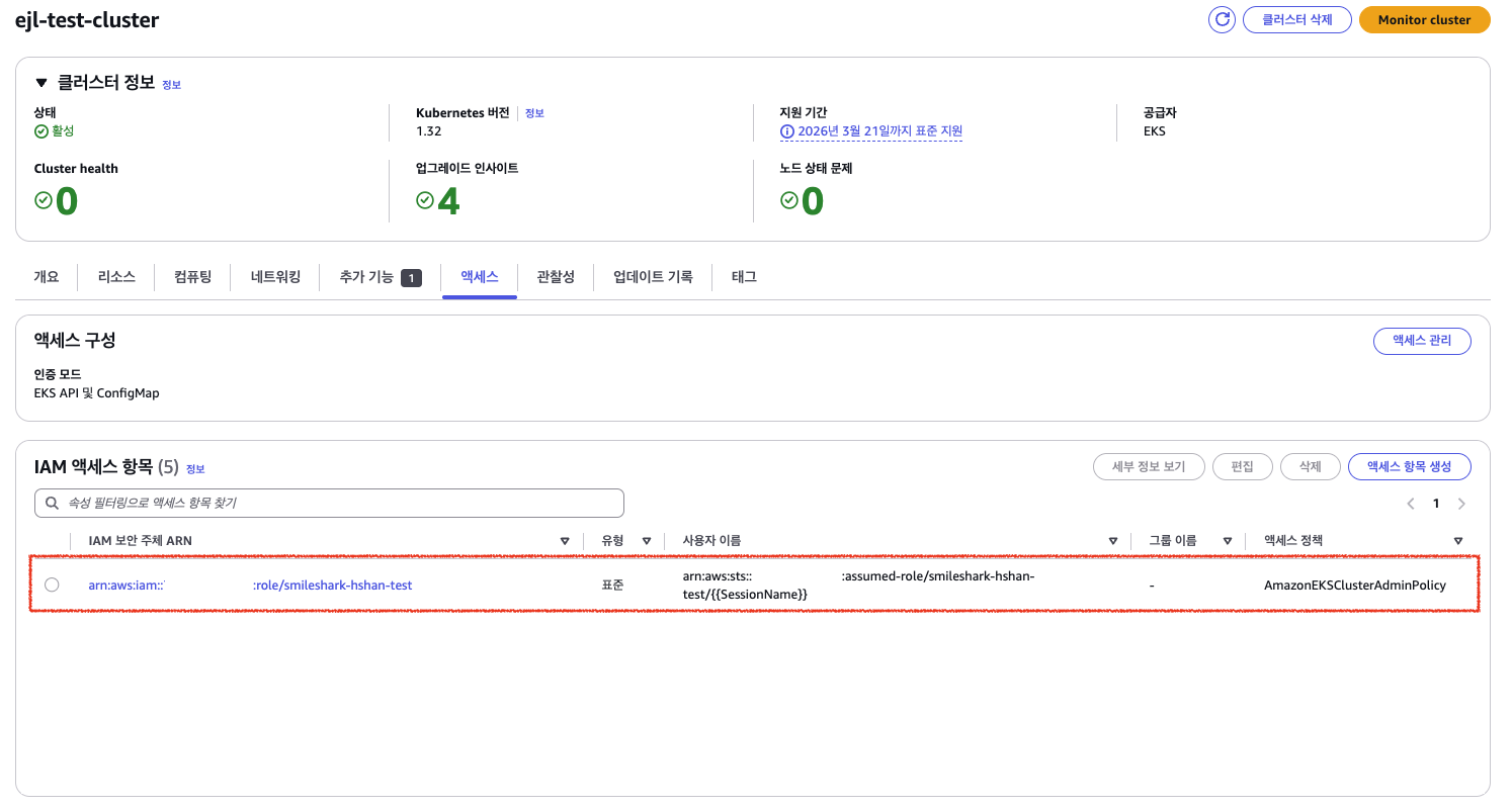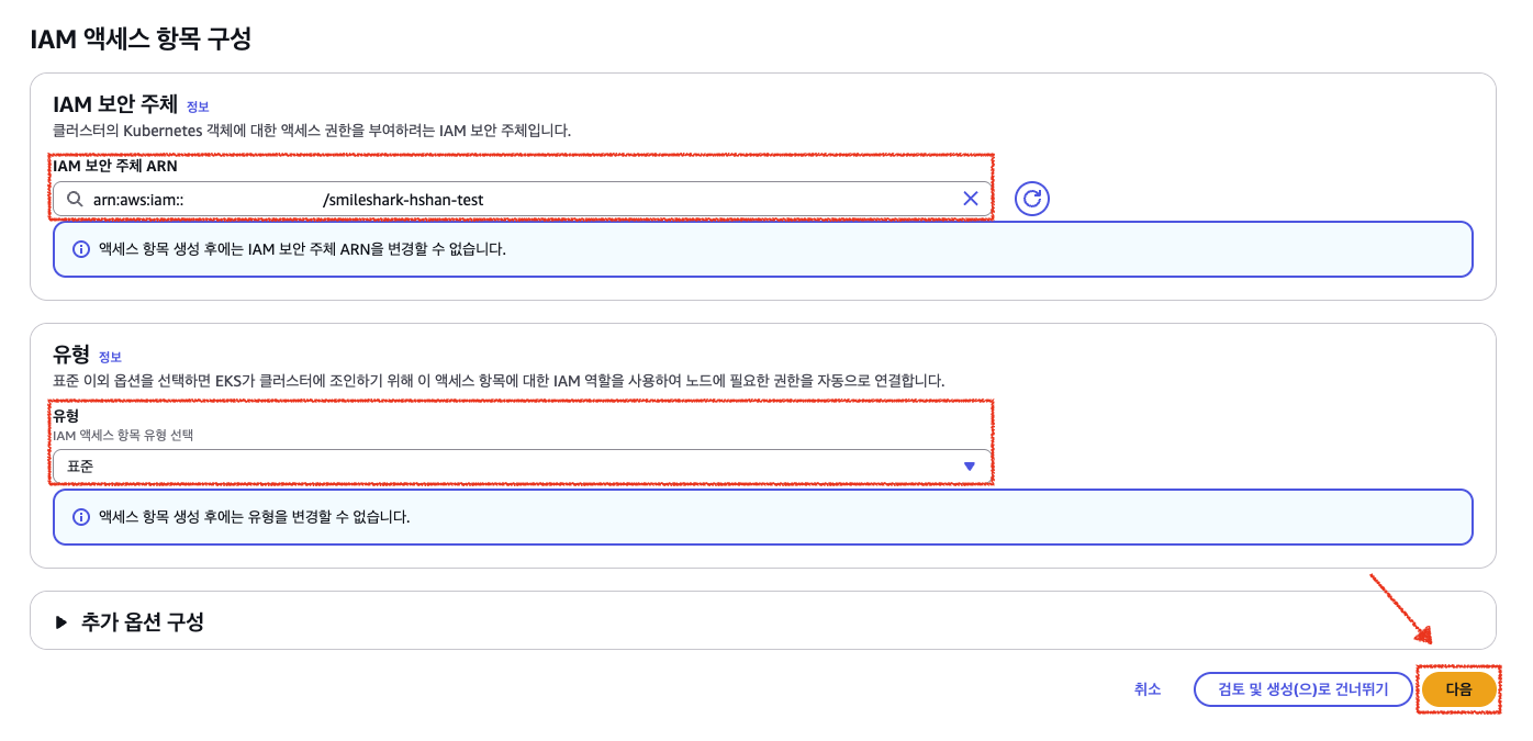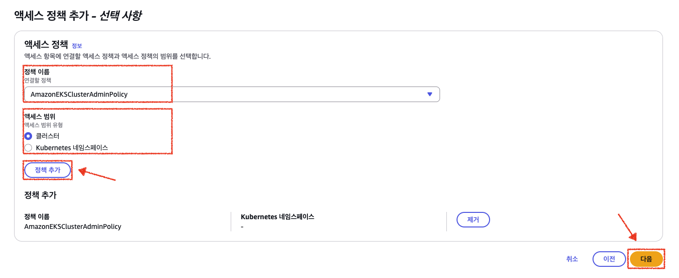 - 클러스터 접근이 필요한 IAM User 혹은 IAM Role을 선택하고 필요한 액세스 항목 유형에 따라 선택 후,