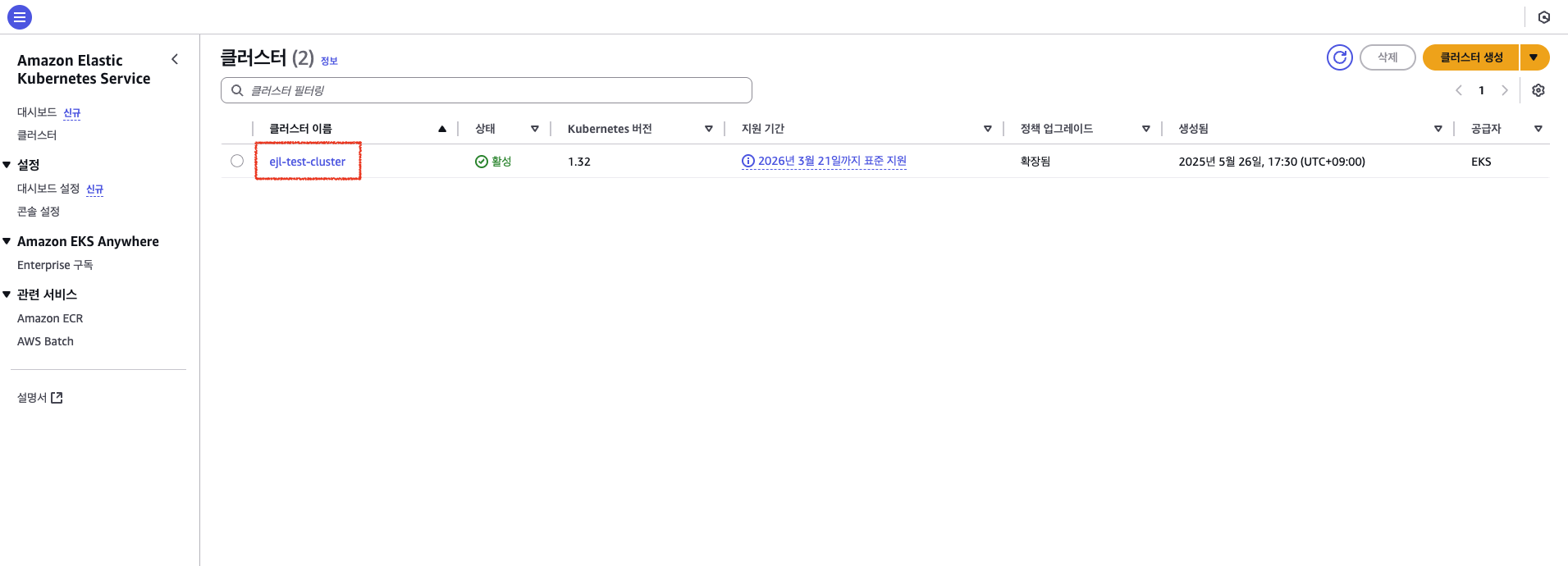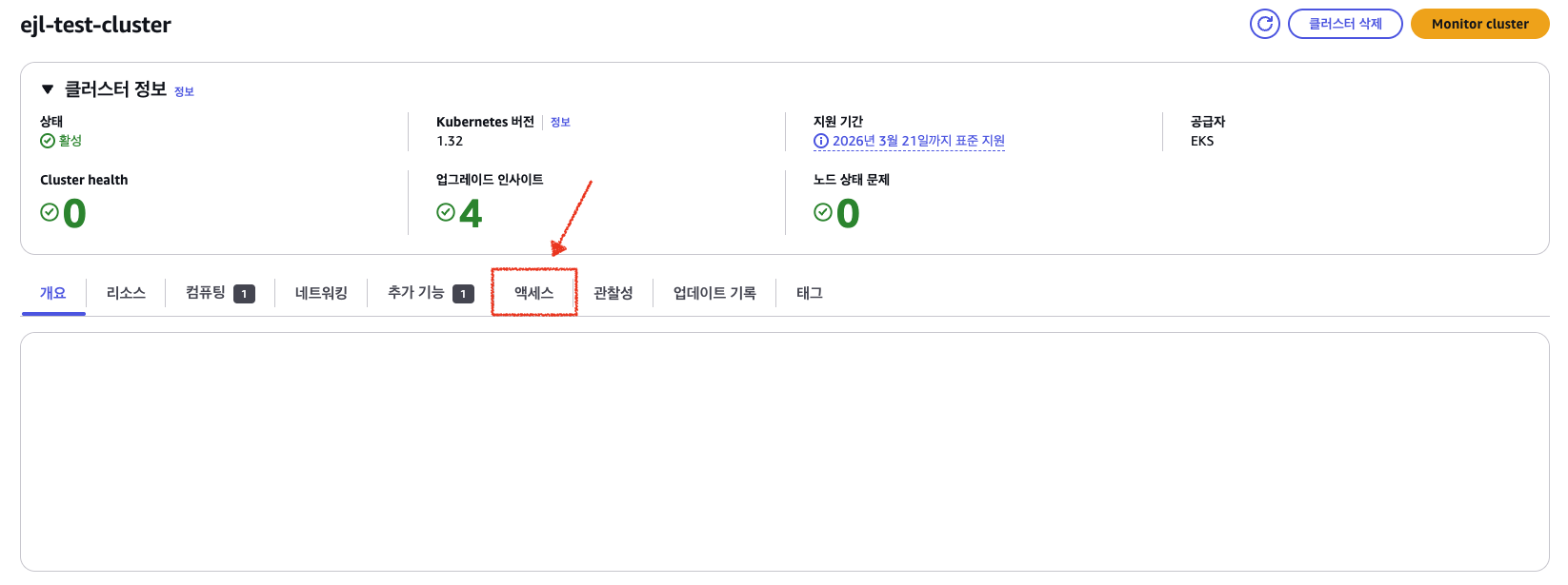 - EKS Console로 접근하여 액세스가 필요한 클러스터를 클릭합니다.