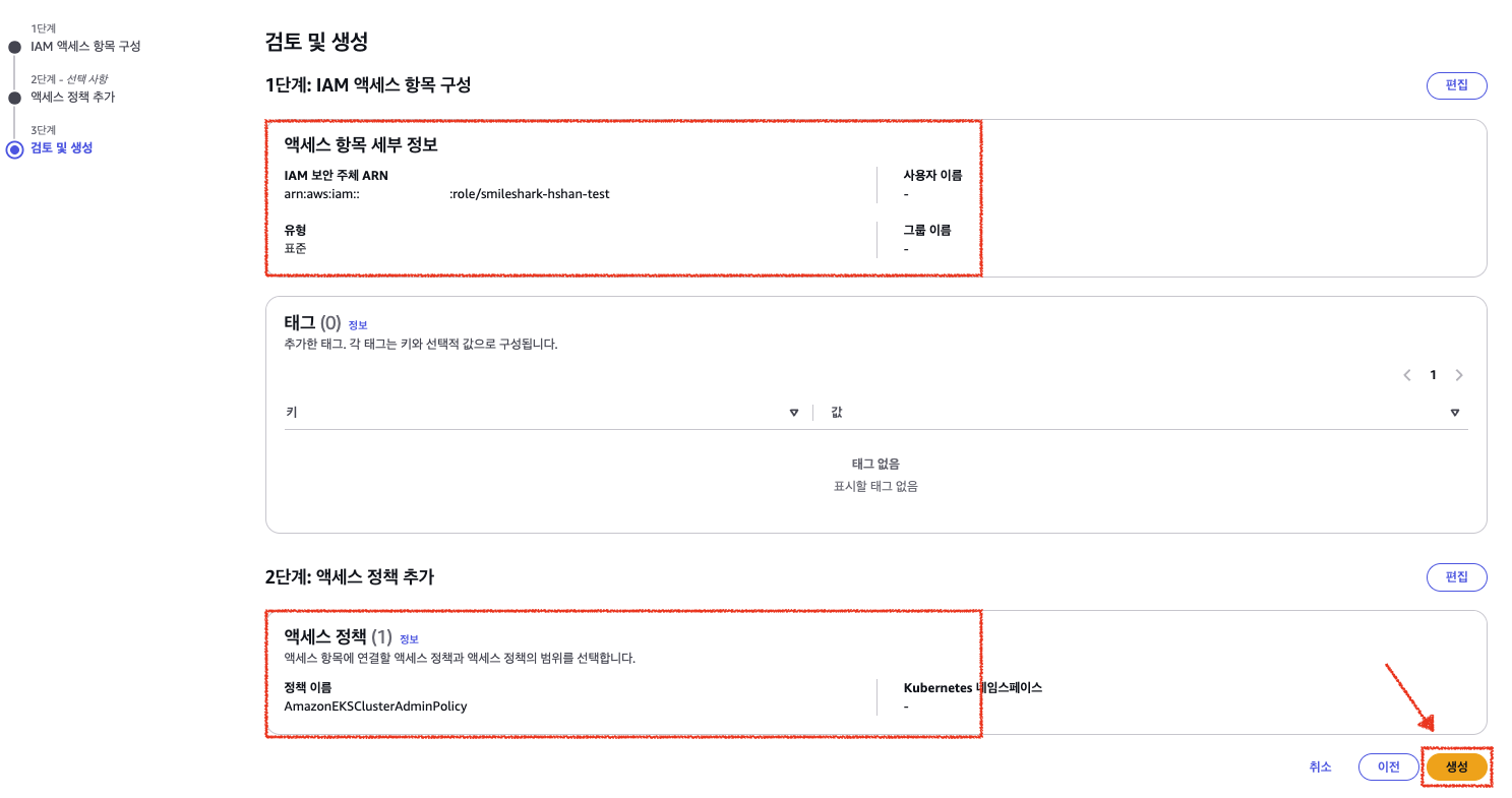 - 진행한 설정에 대하여 추가적인 검토를 진행 후, 하단의 [생성]을 클릭합니다.