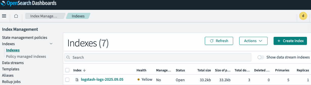 좌측 상단의 줄3개의 메뉴를 클릭 후 Management에서의 Index Management 클릭 왼쪽에서의 Indexs 클릭 logstash의 로그가 저장된 것을 확인할 수 있음