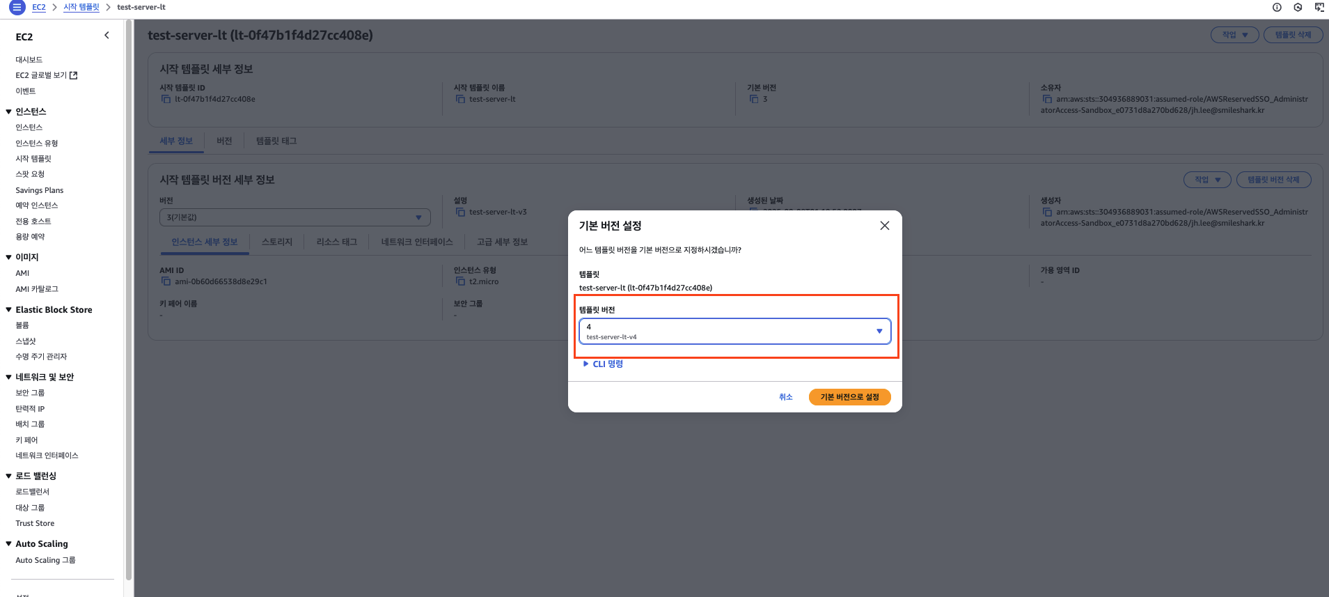 3. 적용하고자 하는 오토스케일링 그룹 을 클릭하고 시작 템플릿을 클릭합니다. 이후 템플릿 수정을 누릅니다.