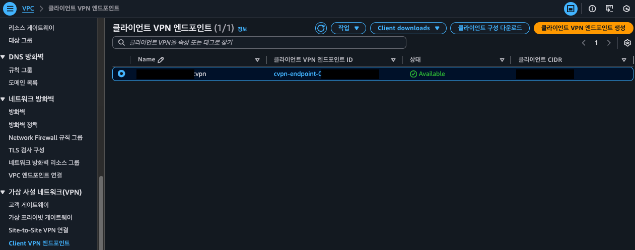 AWS Console -> VPC -> Client VPN 엔드포인트 (가상 사설 네트워크 섹션에 존재)