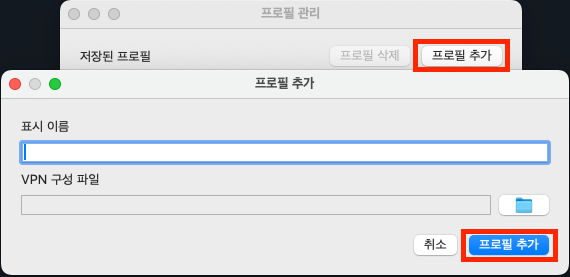 표시 이름 작성 및 VPN 구성 파일 업로드 완료 후 프로필 추가 클릭