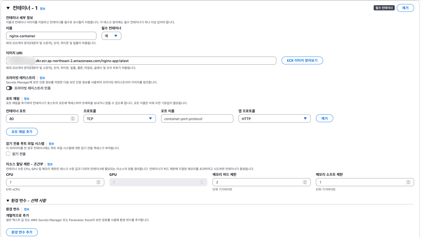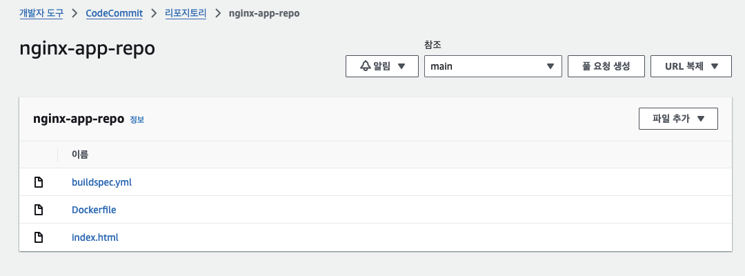 123456789012.dkr.ecr.ap-northeast-2.amazonaws.com/nginx-app - 이 URI는 나중에 buildspec.yml에서 사용됩니다.