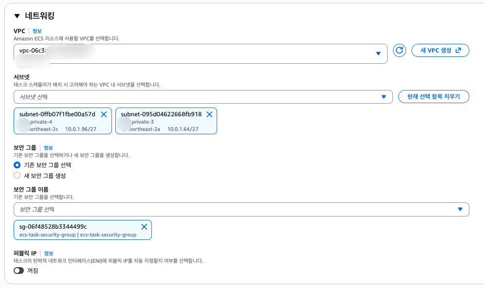 참고: 프라이빗 서브넷에서 ECS 작업 실행 시 ECR 접근을 위해 NAT Gateway 또는 VPC 엔드포인트가 필요합니다. 테스트 목적으로는 퍼블릭 서브넷 사용 가능합니다.