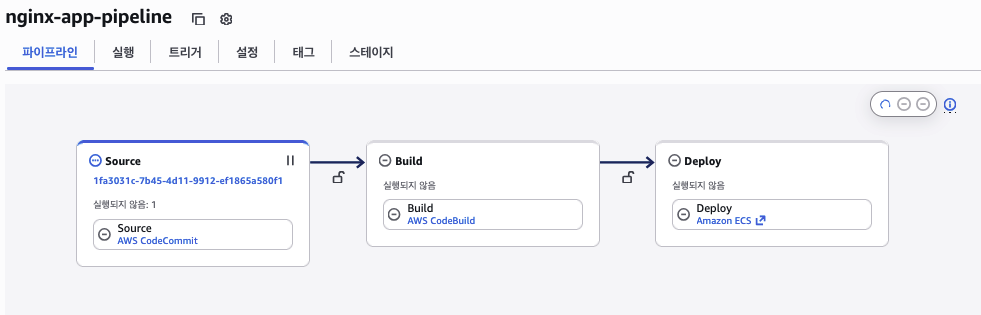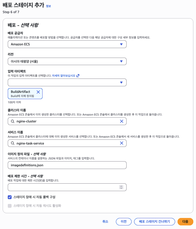 해결방법: IAM 콘솔에서 CodePipeline 서비스 역할(AWSCodePipelineServiceRole-ap-northeast-2-nginx-app-pipeline)의 ECS 배포 정책을 편집하여 33번째 줄의 Resource ARN을