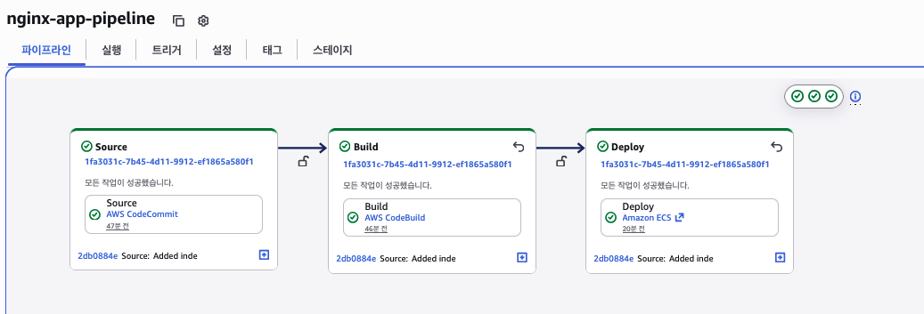 nginx-app-pipeline선택 - 각 단계의 실행 상태 확인: