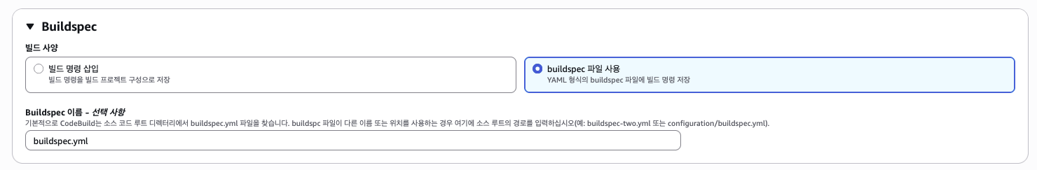 - 빌드 공급자: AWS CodeBuild 선택