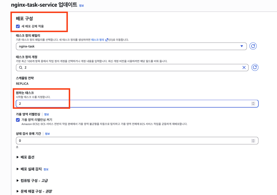 새 배포 강제 적용 체크 후 태스크 개수를 변경합니다.