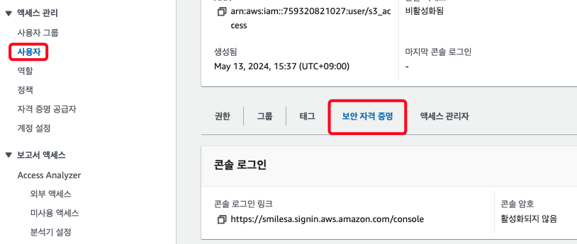 - 새로 생성한 사용자 선택 > 보안 자격 증명으로 이동합니다.
