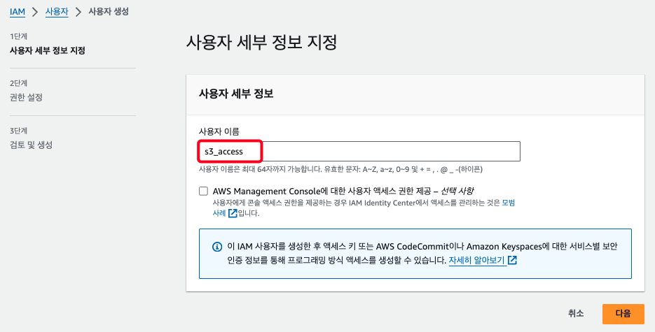 - 직접 정책 연결에서 AmazonS3FullAccess 정책을 선택합니다.