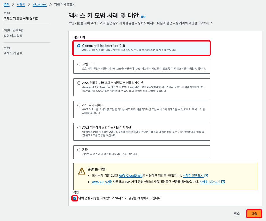 - Command Line Interface(CLI)를 선택 후 다음 버튼 클릭합니다.