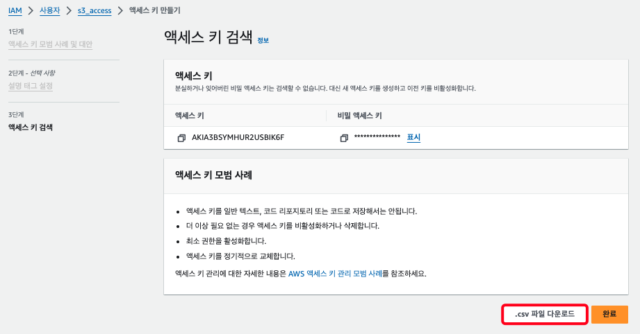 - .csv 파일 다운로드 후 액세스 키 생성을 완료합니다.