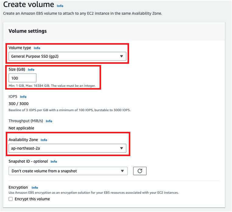 Volume type과 Size , Availability zone을 설정해줍니다. ( 설정마다 비용이 다릅니다 )