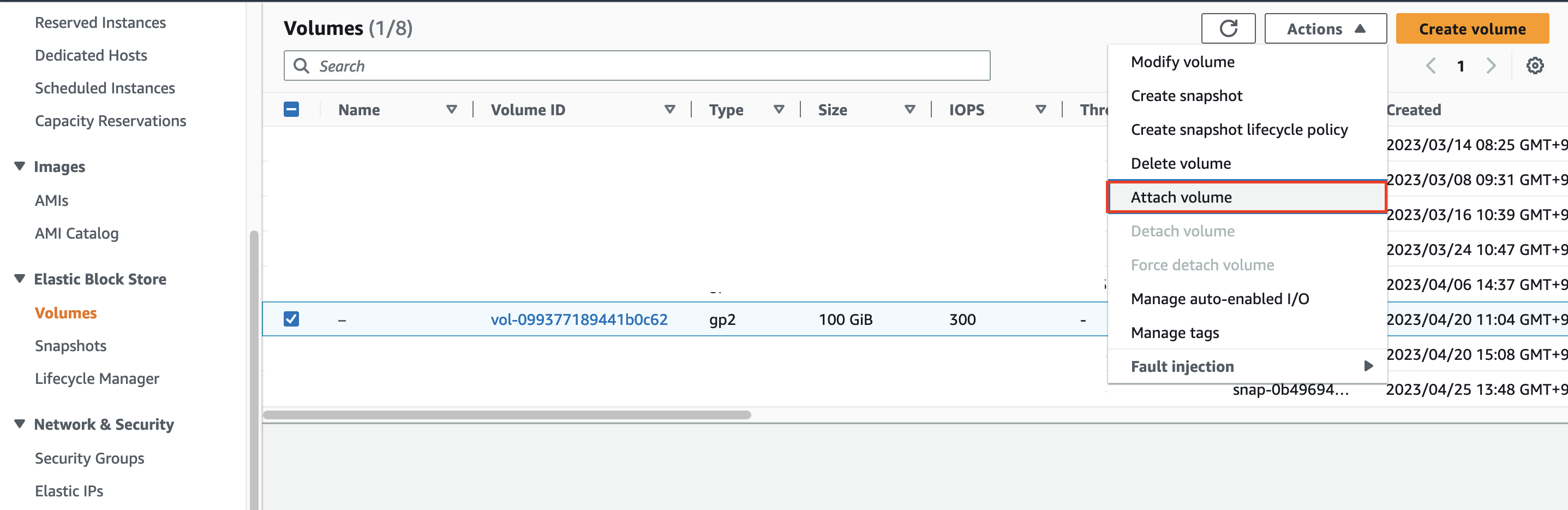 Detach 한 volume 을 다른 인스턴스에 다시 같은 방법으로 Attach 합니다.