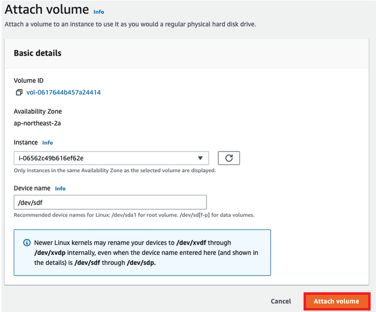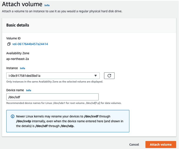 (root volume 이름은 /dev/xvda 이며 data volume은 /dev/sd[f~p] 이니 참고 바랍니다)