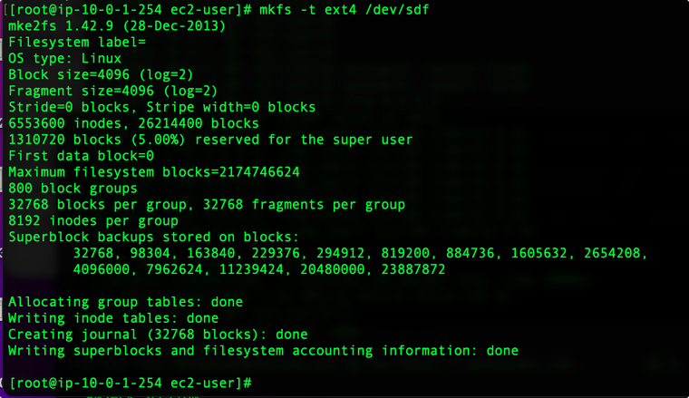 $ mkfs -t ext4 (volume name) 로 volume을 포맷해줍니다.