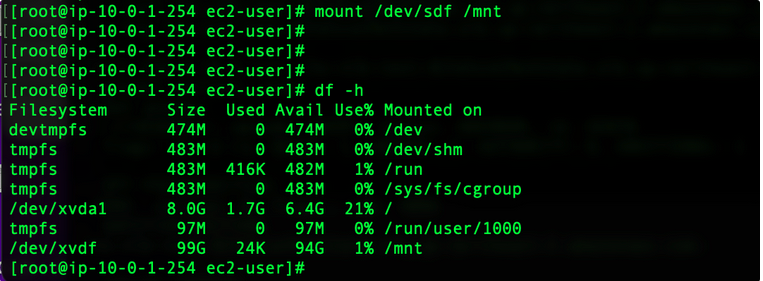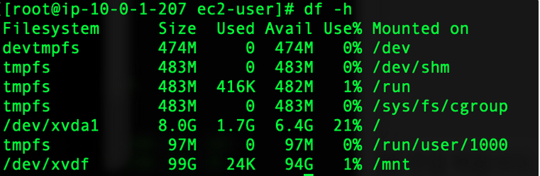 맨 아래 100G volume이 mount 된 것을 확인해 볼 수 있습니다.