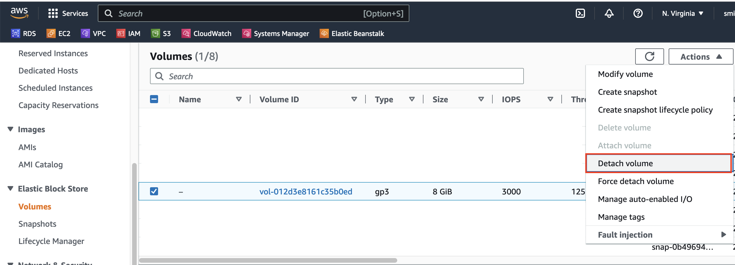 Elastic Block Store - Volume으로 돌아가 Detach volume 시켜 줍니다.