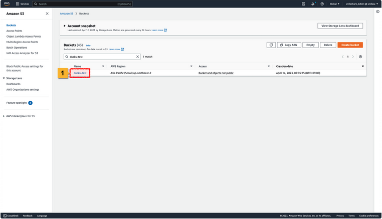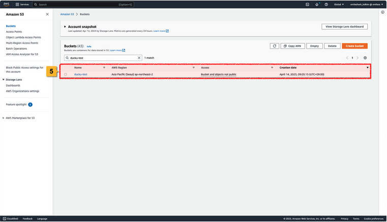 5. Amazon S3 Bucket이 정상적으로 생성된 것을 확인할 수 있습니다.