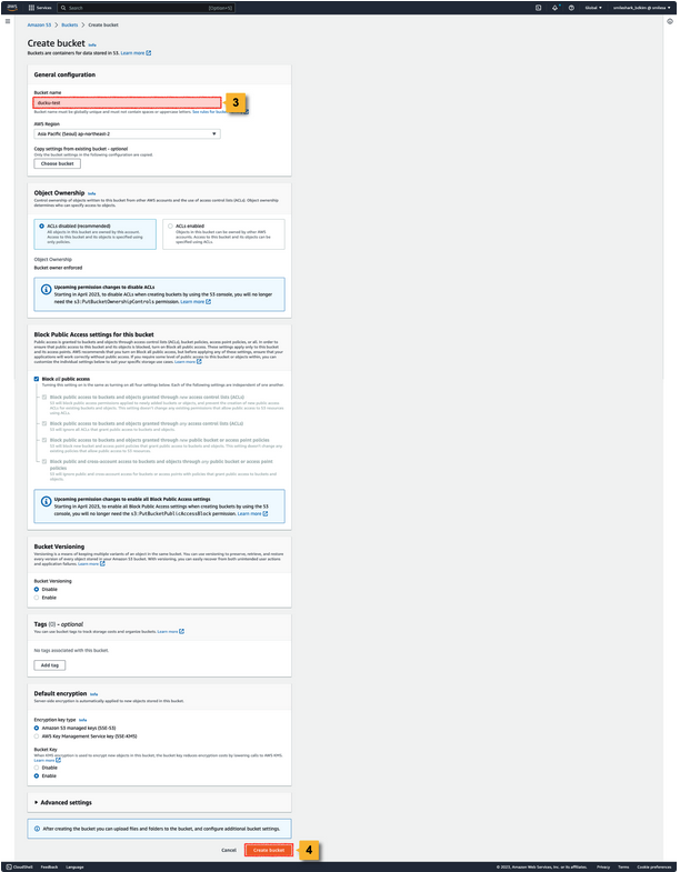 3. 생성하려는 Amazon S3 Bucket의 이름을 입력합니다. - 이름은 Unique 해야 합니다.