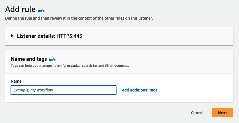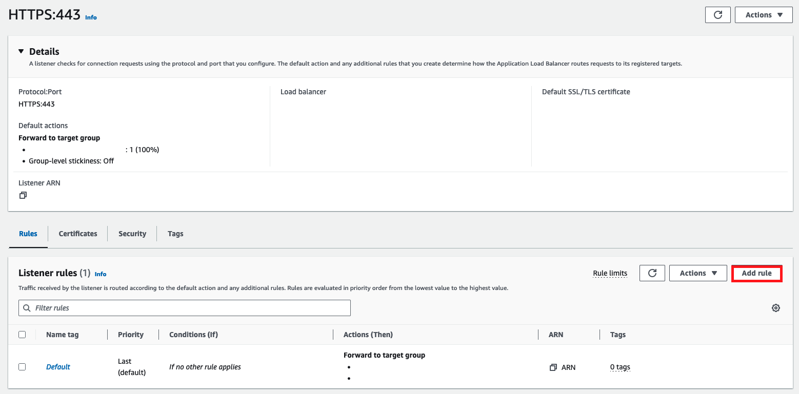 아래 사항은 443 Listener 내 룰을 적용하는 예입니다.