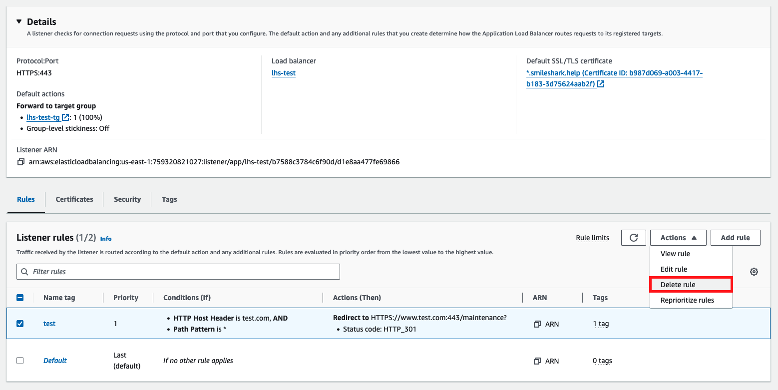해당 ALB 내 점검 페이지로 리다이렉션 룰을 적용할 Listener를 확인합니다.