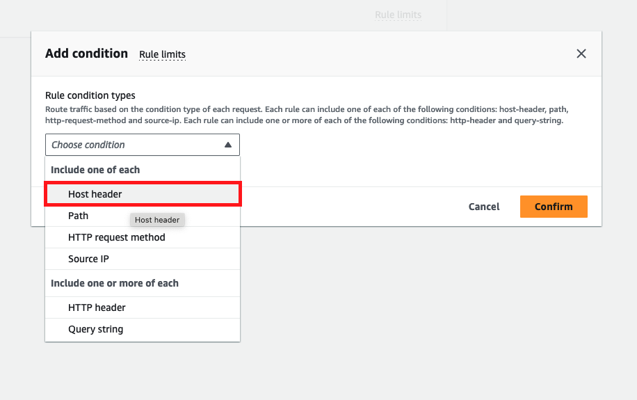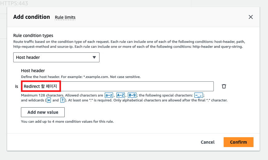 Add condition 에서 Host header 버튼을 눌러줍니다.