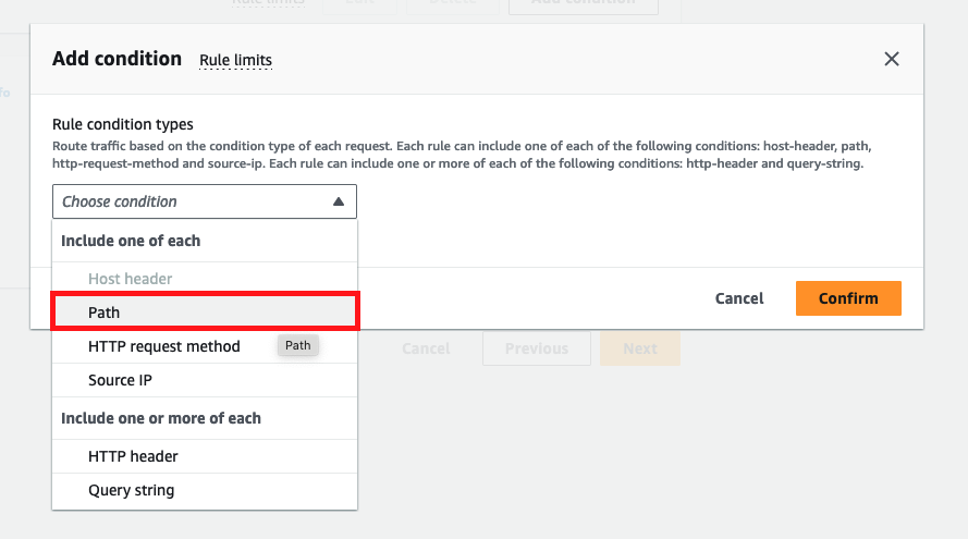 추가로 Add condition 버튼을 눌러 Path 를 선택해 줍니다.