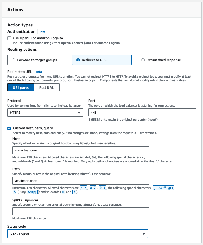 "Redirect to URL" 을 선택 후 HTTPS - 443 으로 설정합니다.